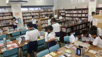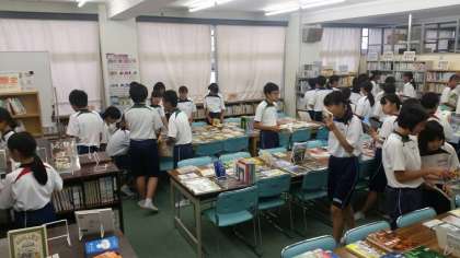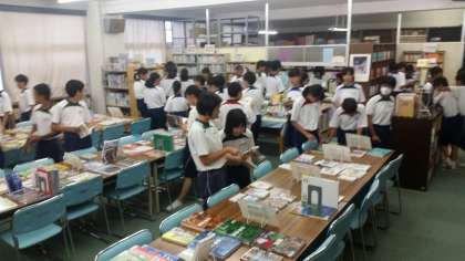 昼休みの図書室です。新着図書の展示会で大変賑やかでした。