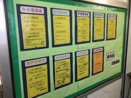 学校の中心であることが伺える、2年生の委員会活動を伝える廊下の掲示物。