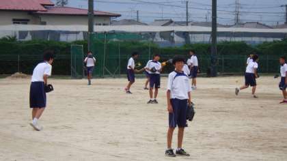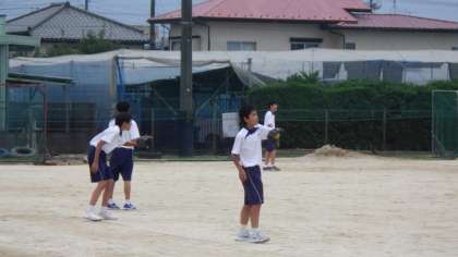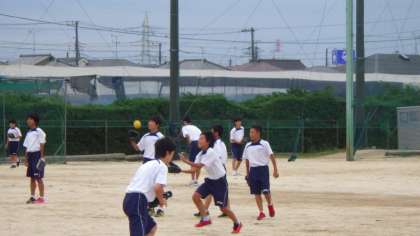 2年生の男子体育はソフトボールに取り組んでいます。下から投げる投手の練習を楽しそうにやっていました。