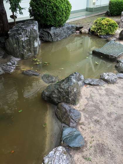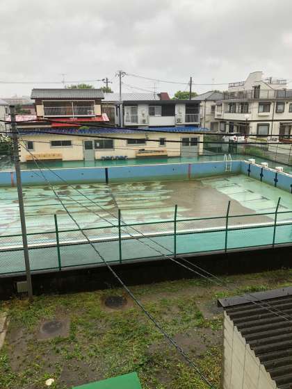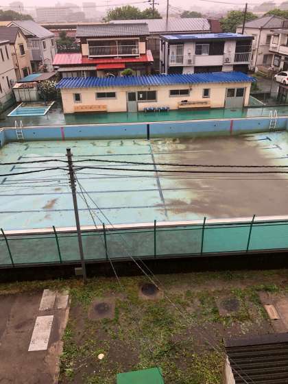 大雨がプール掃除をしてくれました。学校の池の水位がかなり上がりました。