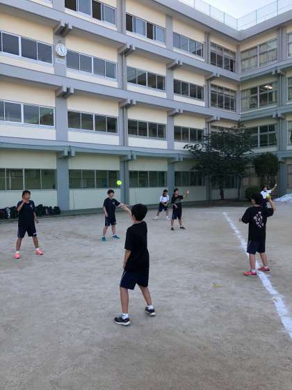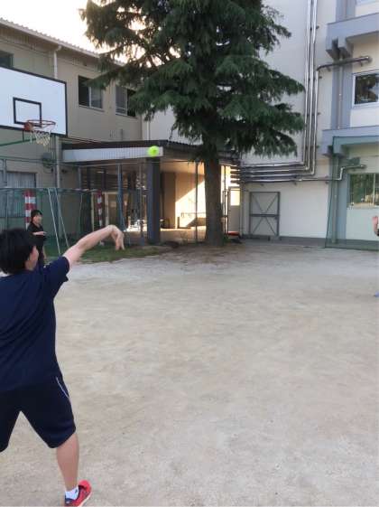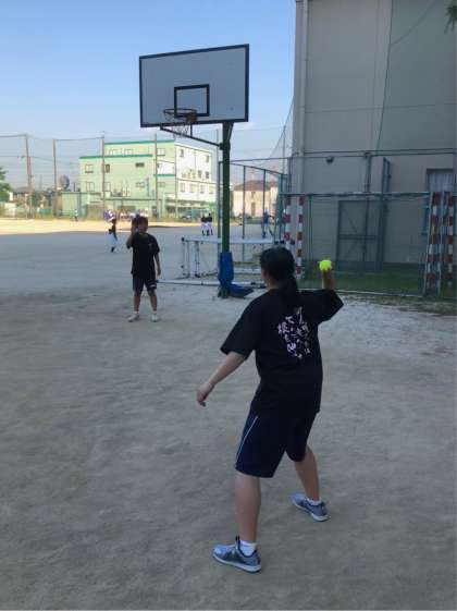 外練習。テニスボールで片手キャッチボール。キャッチ力を向上させます。