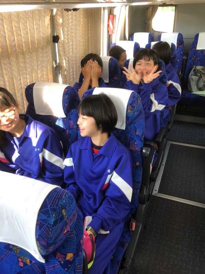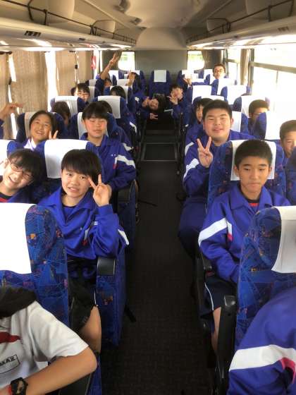 出発式を終え、バスに乗りました。外は暑くなりそうですが、バスの中は快適です。朝早くからのお子さんの送り出し、ありがとうございました。特に昨日、小学校運動会のご家庭は連日の早起き、たいへんでした。