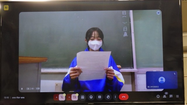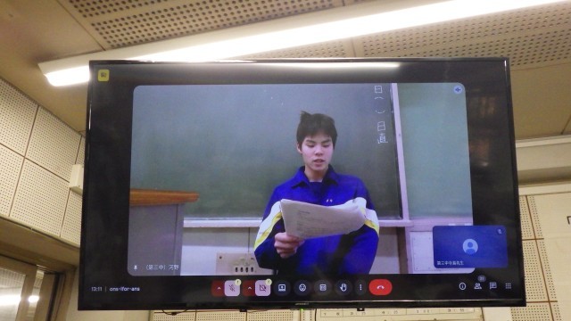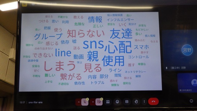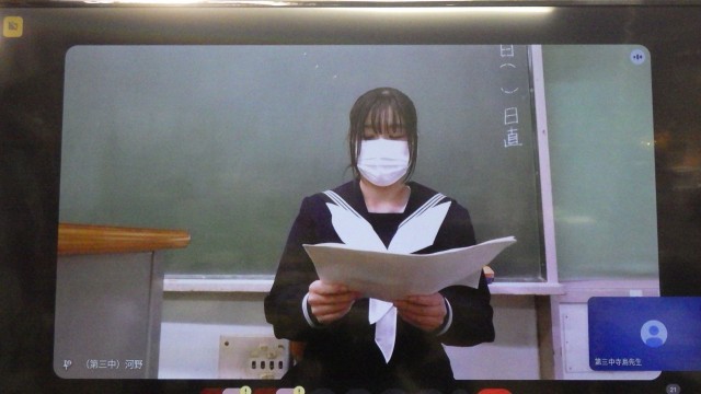 本校ではいじめの「未然防止」の取り組みとして、生徒の自発的・主体的な企画運営で「いじめ予防集会」を年間に2回実施しています。生活委員会が中心となり、企画運営していますが、今回は「SNSを活用したインターネットトラブル」を題材に自作した動画を放映し、全学級でグループワークを行いました。グループワークで討議した内容は、その後Meetを通じたオンラインで、発表を行い、意見の共有を行いました。また、集会後には先日のハートフルヒューマンフェスタで人権作文を発表した3年生生徒が自身の作文を読み上げました。テーマは「自殺対策」に係る内容で、「命の大切さ」を訴える素晴らしい発表でした。