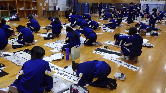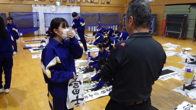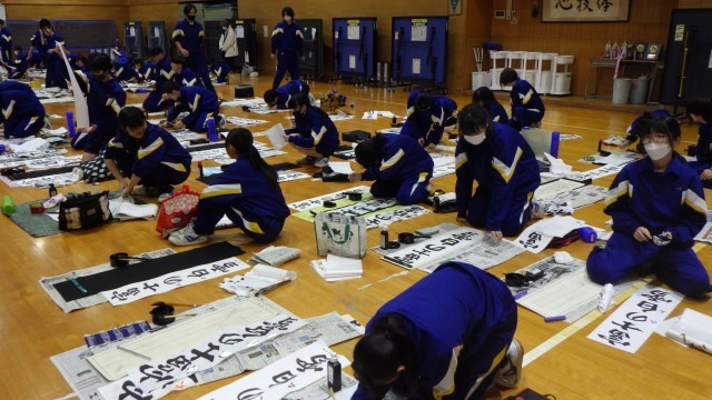 本校では「書き初め」の作品提出を前に、書道の初期指導を特別講師の先生から御指導を受ける時間を設定しています。本日は3年生が御指導を受けましたが、「1年1年積み重ねて、どの子も書に黙々と向きあうことができるようになっています」というお言葉を頂きました。中には「すでに師範並みの腕前ですね」と褒められている生徒もいました。書の世界も、やはり1年1年の積み重ねが大切なのですね。