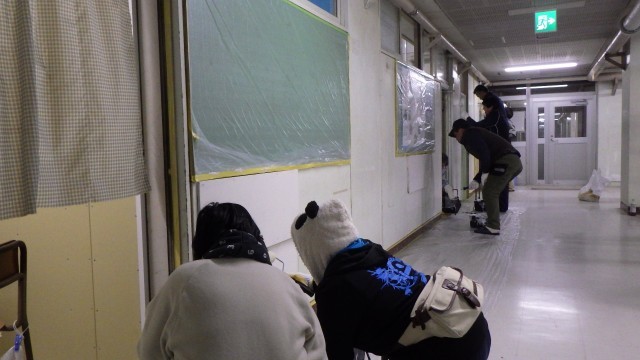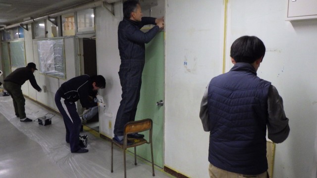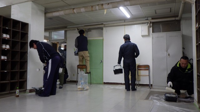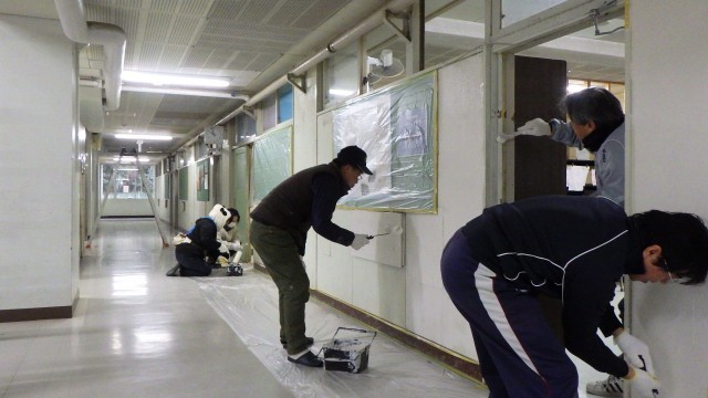 今年度最後の、おやじの会によるボランティア活動は、校内美化活動でした。当初は、欅心館に続く渡り廊下の「板張り」の壁をペンキ塗装して補強する予定でしたが、思いのほか板が劣化しているため、会員様より「板の張り替えをしなければ数年と持たないのでは?」という見たてが出ました。会員でいろいろと話し合った結果、「雪もいつ降り出すかわからないし、今日は1,2年生昇降口前のペンキ塗りに切り替えよう」という結論にいたりました。手分けして、養生テープをはるところから始め、きれいに塗装しました。いつもながら、おやじの会の会員様と作業中も冗談を言いながら、楽しく作業させて頂きました。来年度の新規会員様も募集中なので、ぜひとも御登録をお願いします。