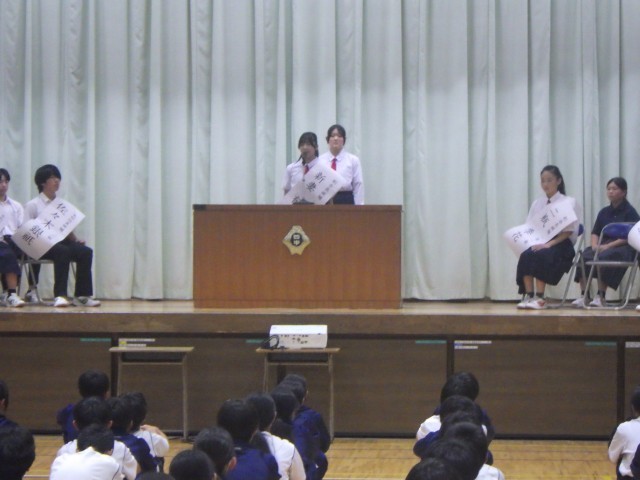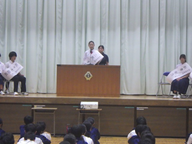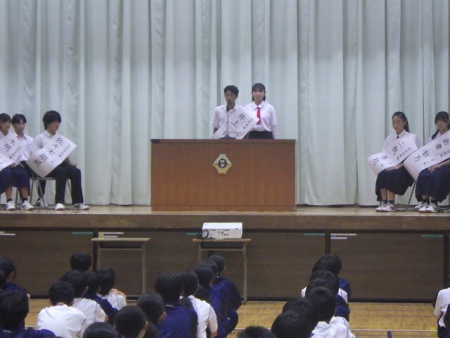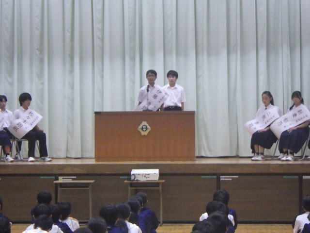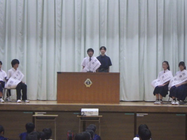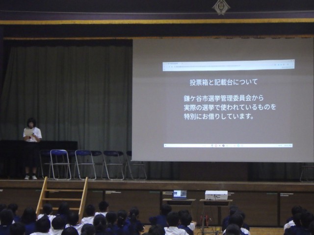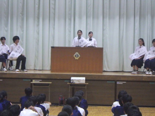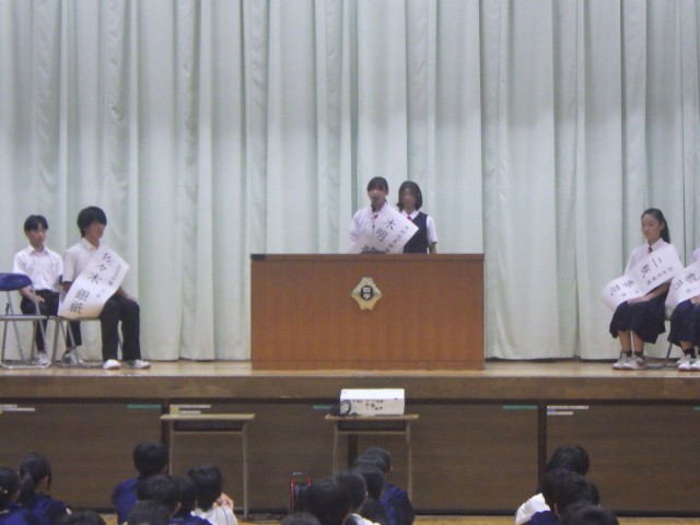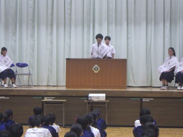 生徒会役員選挙立会演説会 公開日 2025/10/07 更新日 2025/10/07 お知らせ 本日、生徒会役員選挙が行われました。投票の前に、立候補者による立会演説がありました。立候補者一人ひとりが、これからの四中について真剣に考えた想いを伝えていました。 +7 いいね(0)