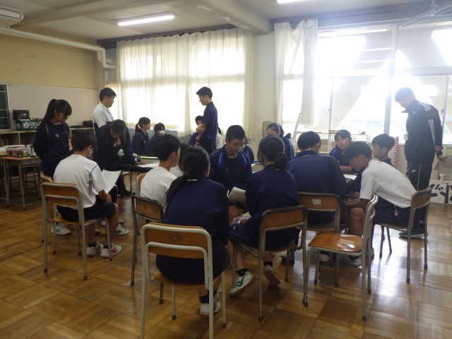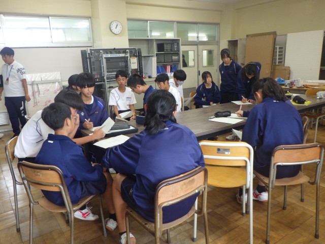 本日の昼休みの様子です。生徒会役員と各委員会の学年長が集まり、前期活動の振り返りと後期活動の引継ぎ準備をしていました。活発に話し合いが行われていて、頼もしいです。