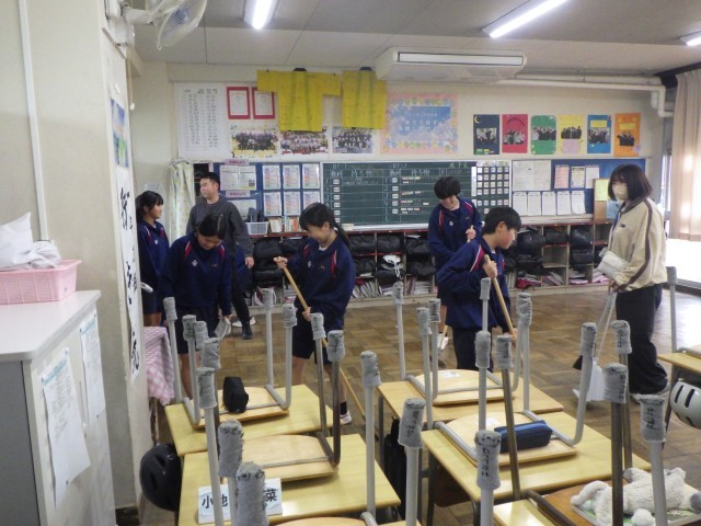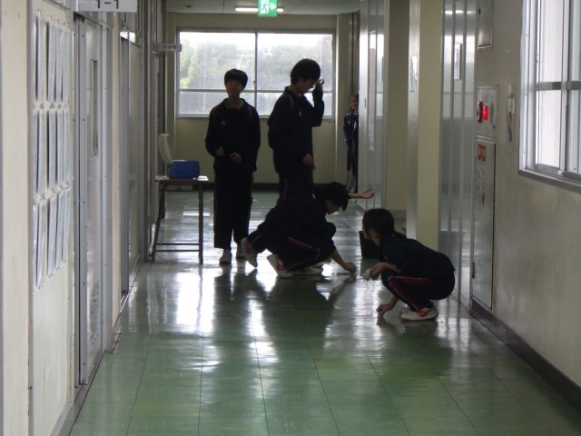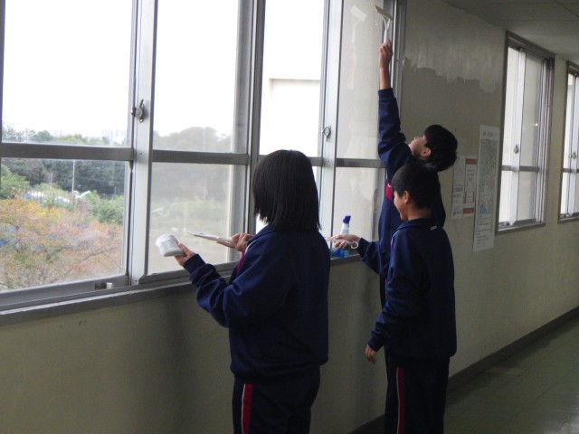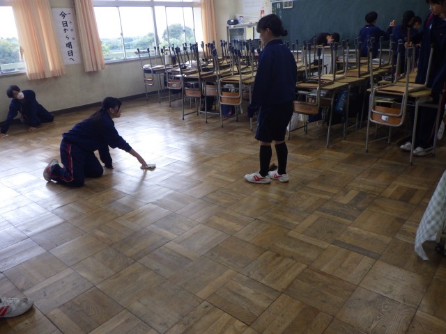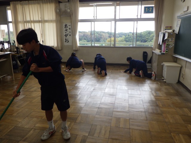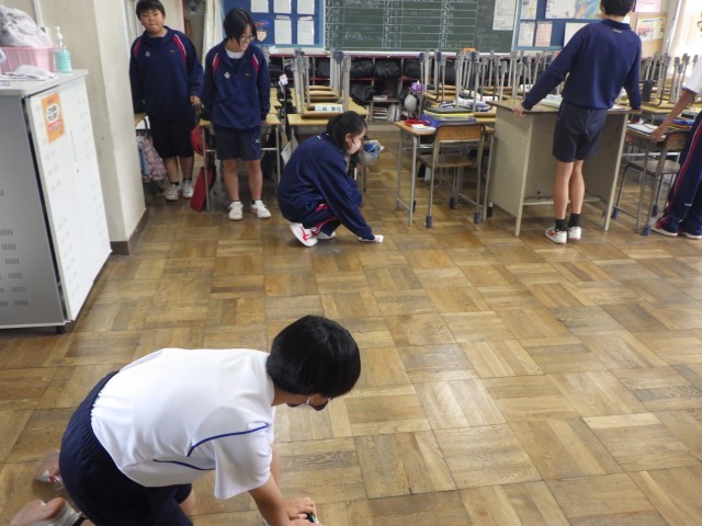 1年生掃除の様子です。慣れた様子で、自分たちの活動している場所を綺麗にしていました。早く終わった人は目立つ汚れを入念に落とし、時間いっぱい取り組んでいました。