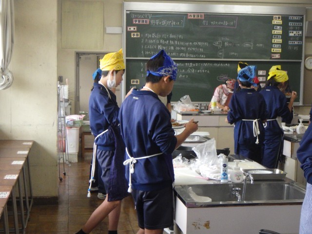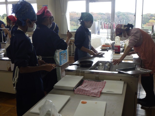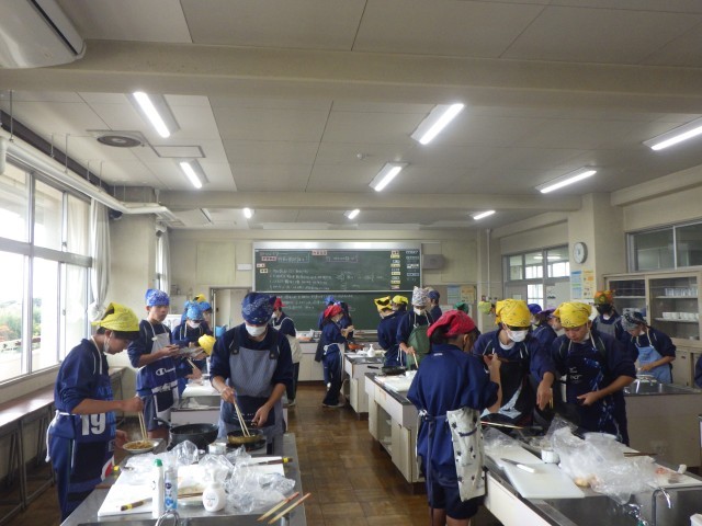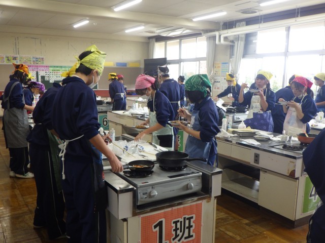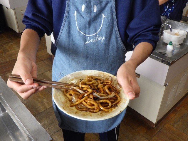 2年生家庭科の授業風景です。今日は焼きうどんの調理実習を行っていました。野菜や肉を切って一緒に炒め、いい焼き具合になるように目を離さずに調理していました。美味しそうな匂いが教室中に広がり、笑顔で味見をしていました。
