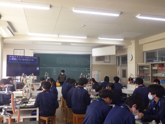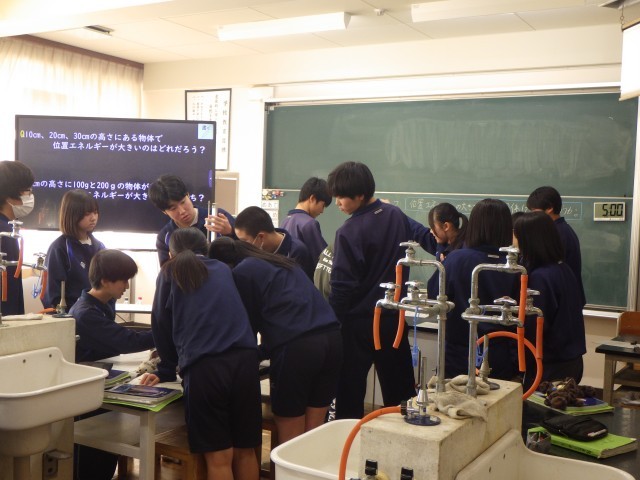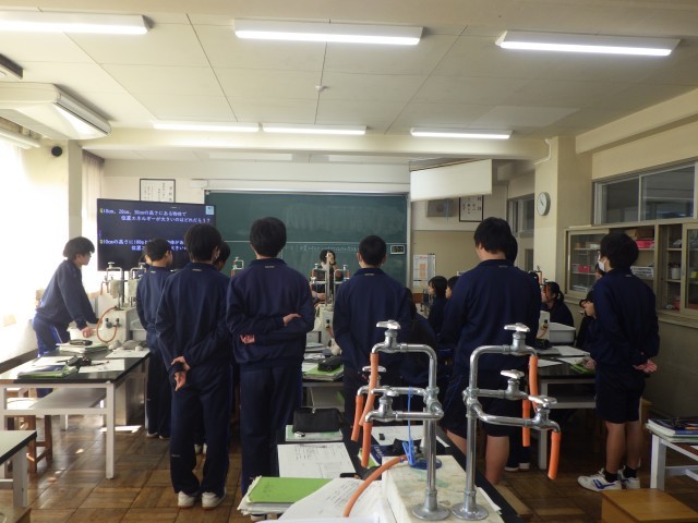 3年生理科の授業風景です。学習課題に対して、実物を使って触ったり、目で確認したりしながら答えを導き出していました。班で協力しながら進めていました。