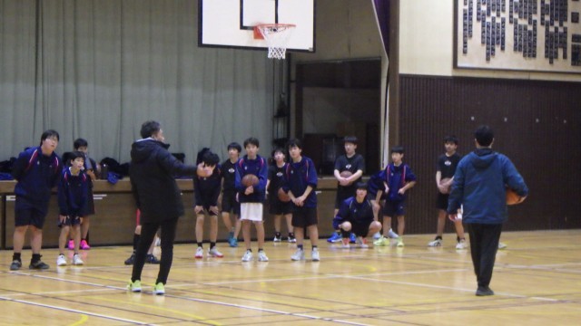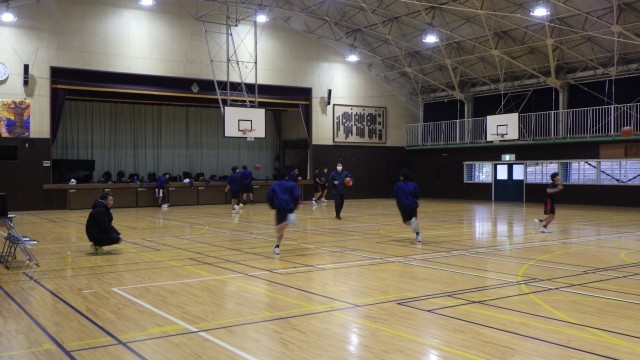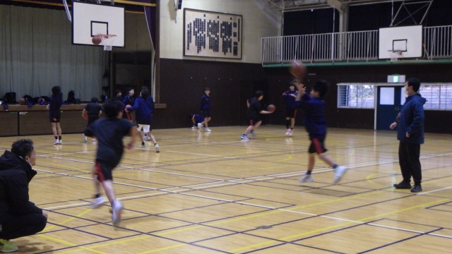 男子バスケットボール部の練習風景です。体育館の全面を使って、スピードに乗りながらパスやシュートを打つ練習をしていました。大きな声の挨拶もあり、体育館内が活気づいていました。