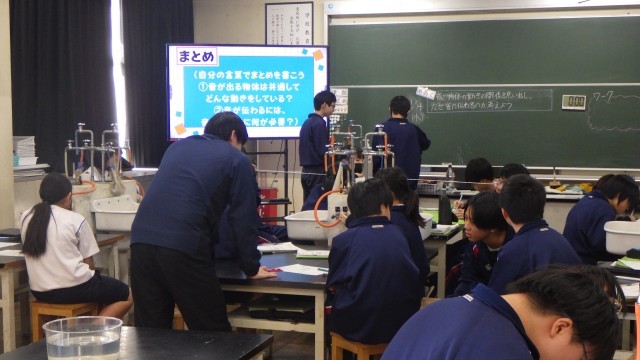 1年生理科の授業風景です。音についての授業で、音と物体の動きの関係に注目しながら、なぜ音は伝わるのかを考えていました。音叉や糸電話等を使って、楽しそうに学んでいました。