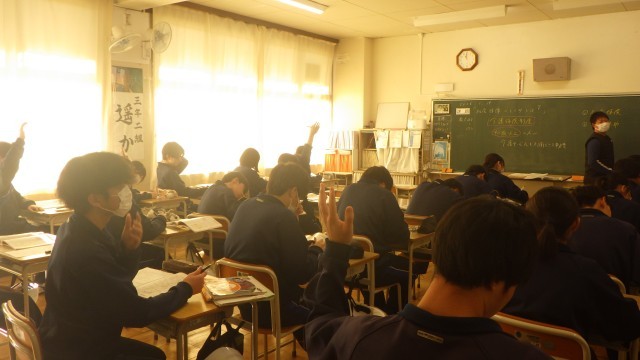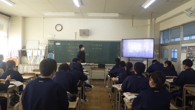 3年生社会の授業風景です。社会保障制度について、鎌ケ谷市や身近な例を出しながら学んでいました。授業の後半は班で相談をしながら、教科書最後の章を学習していました。