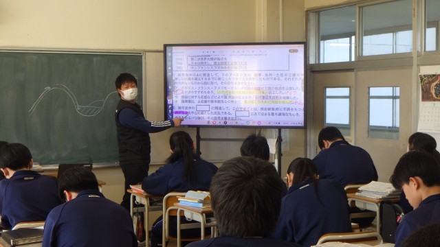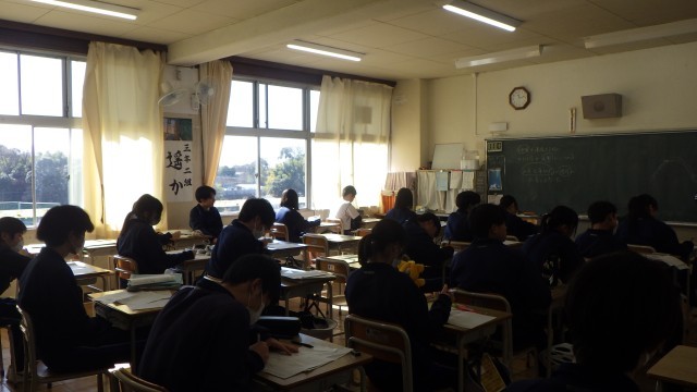 3年生社会科の授業風景です。入試の過去問に近い問題を出題し、テスト対策を行っていました。解き方の丁寧な解説があり、みんな真剣に話を聞いていました。体調を崩さないようにして、ベストを尽くしてほしいです。