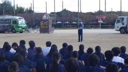 本日午後、校庭にてスケアードストレイト交通安全教室を行いました。この交通安全教室は鎌ケ谷市教育委員会が主催し、プロのスタントマン集団「スーパードライバーズ」が実際の交通事故に近い場面を目の前で演じます。その様子から、生徒自身がヒヤリとする感覚や事故の怖さを知り、今後の交通安全への意識の啓発を図るねらいがあります。鎌ケ谷警察署や交通安全協会の方も参加してくださいました。