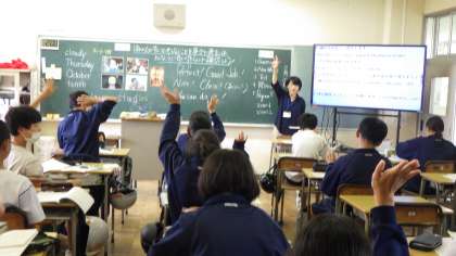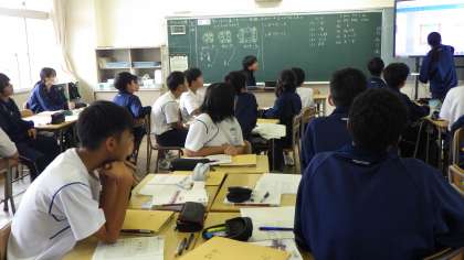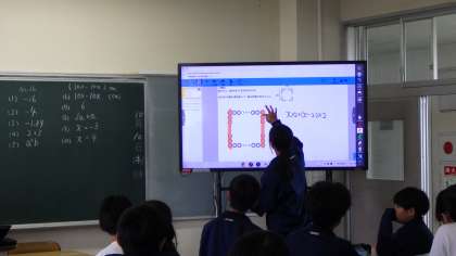 1年生は、数学と英語の授業の様子です。数学は、方程式を用いて問題をどう解いていく流れを、モニターを使って説明していました。説明を聞いている姿も素晴らしかったです。英語は、ほかの人が行う動作をどう説明したらよいか考えていました。周りの人と協力して、理解を深めていました。
