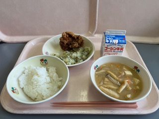 ご飯 牛乳 鶏肉の唐揚げ 青のりポテト 大根としめじの味噌汁
